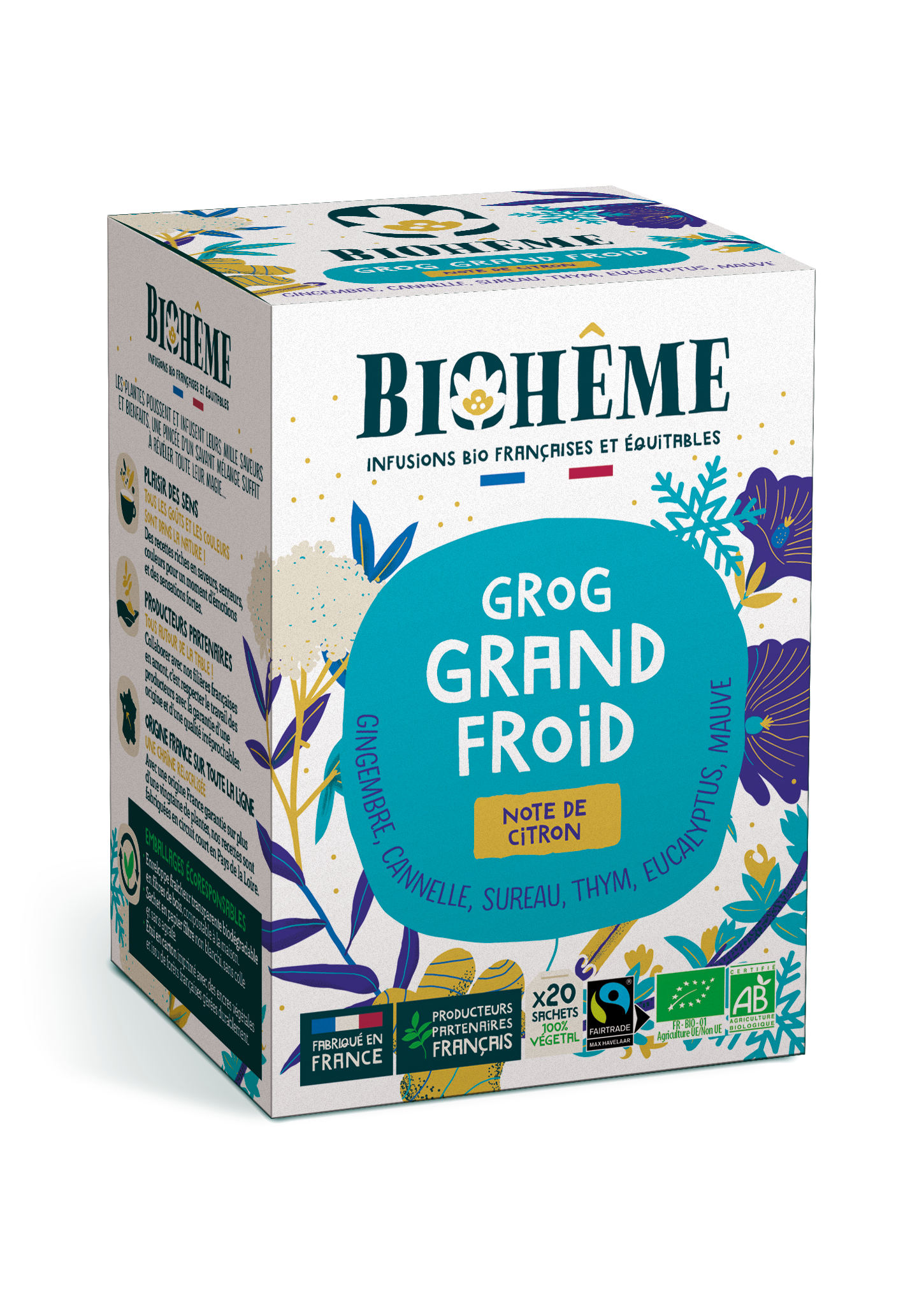 Thym, mauve, sureau bio origine France..Étui recyclable en carton issu de forêts françaises et imprimé en France..Enveloppe fraîcheur en fibre de bois