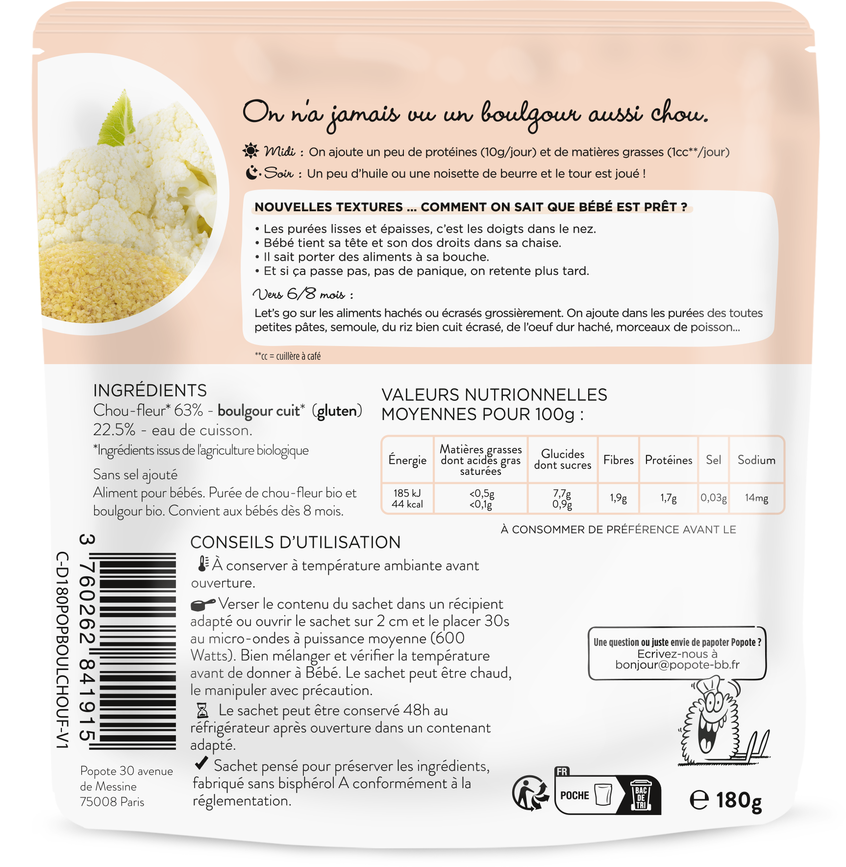 Chou-fleur 63% - Boulgour cuit (gluten) 22.5% - eau de cuisson.